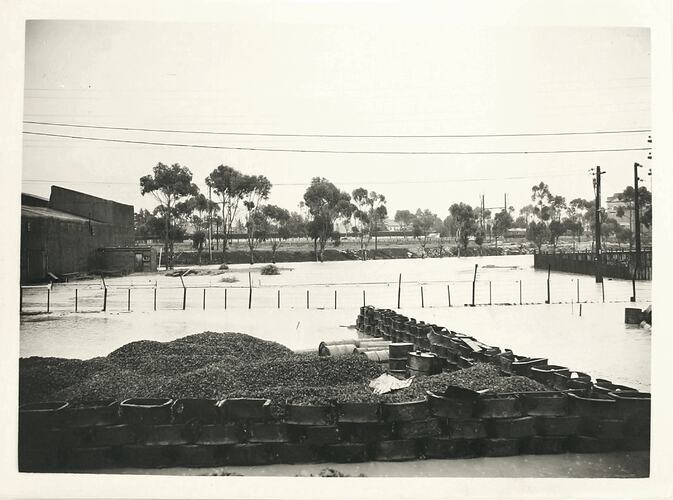 Flood damage at H. V. McKay Massey Harris Pty. Ltd. Factory, Sunshine, 1946. Flooded area with a building and partially submerged fence in the middleground. The foreground has stacked rubber or plastic hollow sections acting as a dam that have been backfilled with gravel. Trees and buildings are visible on higher land in the background.