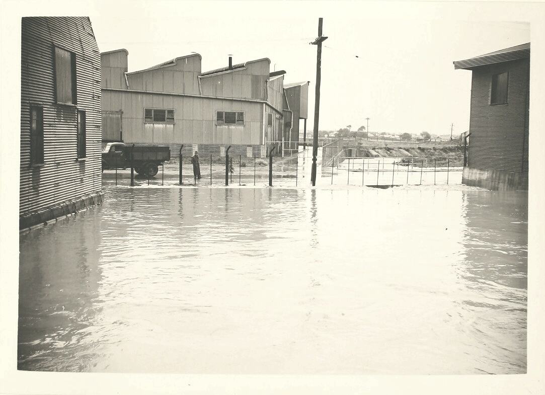 Black and white photograph of flood damage at H. V. McKay Massey Harris Pty. Ltd. Factory, Sunshine, 1946.