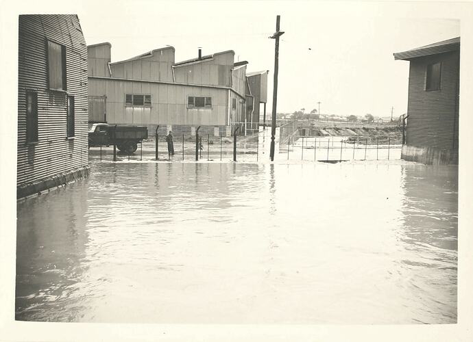 Flood damage at H. V. McKay Massey Harris Pty. Ltd. Factory, Sunshine, 1946. Flooded area with two buildings either side and one in the background behind a fence. A man also stands behind the fence near a truck. He wears a long coat and hat. Building on right is where foundry moulds made, on left is apprentice training area, and in background foundry.