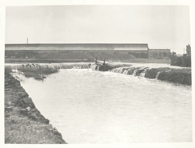 Flood damage at H. V. McKay Massey Harris Pty. Ltd. Factory, Sunshine, 1950. A flooded central section has water cascading and streaming into it from the two sides. Factory buildings are visible in the background. This large building is a storage shed along Ballarat Road (later became "Melbourne Branch").
