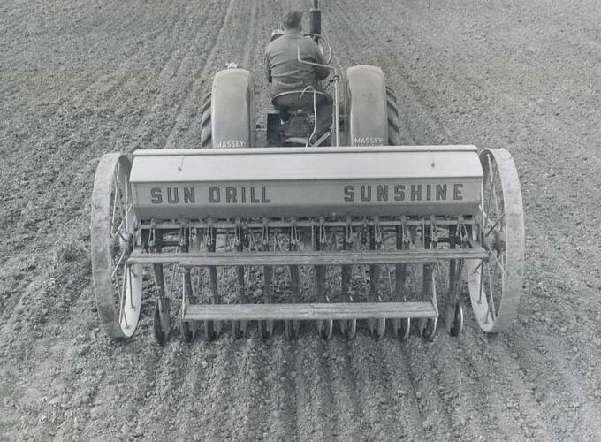 Twelve Row Sun Drill drawn by Sunshine Massey Harris tractor sowing oats in the Keilor district, Victoria in June, 1951.