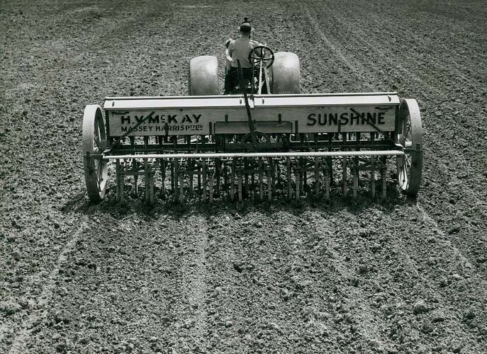 Photograph of a Sunlea Seed and fertilizer Drill. This image forms part of the H.V. McKay Old Archive, which includes personal correspondence, agreements, contracts, prospectus, company publications, photographs, information about staff and social activities, documents regarding farmers visits, articles and claim of invention for the sunshine harvester stripper and documents relating to McKay's harvester works.