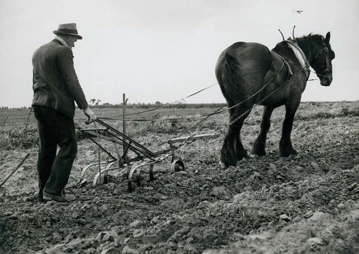 Man using a No.18A Sunshine Satellite cultivator being drawn by a single horse on the property of Billings Bros. of Burwood, Victoria.