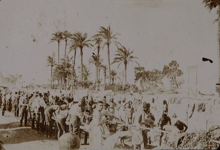 Indian and Australian soldiers, in a long line, are collecting water in buckets and washing things. The water is coming from taps attached to a metal pipe suspended over a very long low narrow platform. The Indian soldiers all seem to be hatless and most seem to be naked above the waist. The Australian soldiers are without their jackets, exposing their braces, have rolled up their sleeves and still wearing their hats. In the background are tall palm trees.