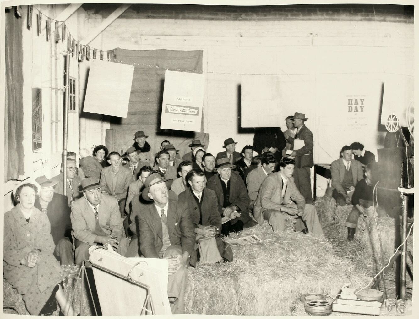 Seated crowd of farmers watching a Sunshine Massey Harris presentation at the Hay Day in Warragul, circa 1955. Sunshine Massey Harris promotional posters hang across the rear of the room and hay bales act as seating. A projector is set up at the right and a sign in the middle of the rooms reads: 'Ask for a Demonstration on your farm'.