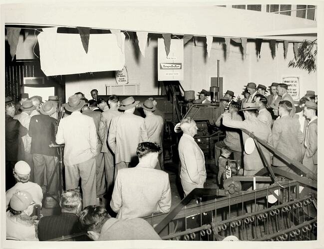 Sunshine Massey Harris promotion at Wagga Wagga, New South Wales, circa 1955. A crowd stand in a room and watch as a Sunshine Massey Harris representative performs a demonstration using agricultural machinery. Other equipment is set up in the room which is decorated with flag bunting and gum tree branches.