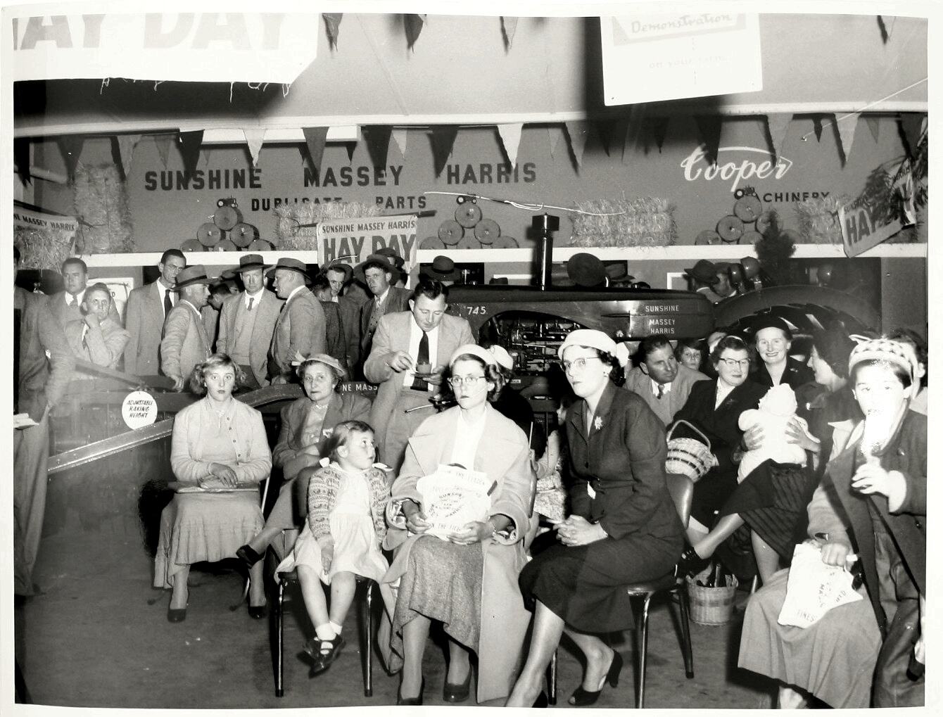 Men stand in a room set up for a Sunshine Massey Harris demonstration using agricultural machinery. Equipment is set up near the rear of the room and the back wall is decorated with Sunshine Massey Harris promotional signs, pyramids of baler twine with model tractors at the apex. Women and children sit in the foreground. Flag bunting, hay bales and gum tree branches decorate the room.