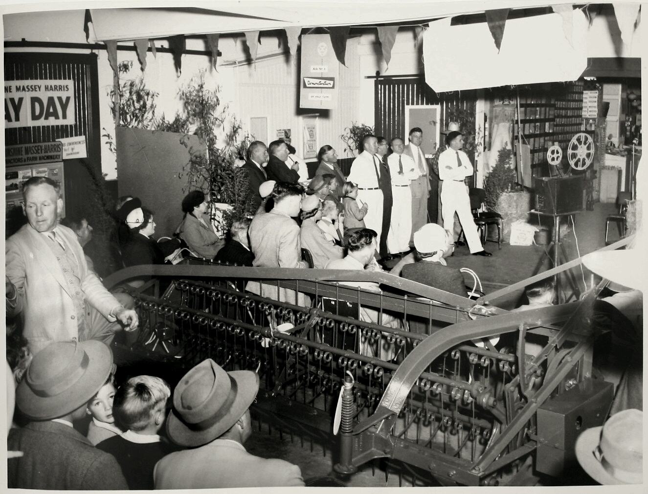 A seated crowd watch a Sunshine Massey Harris promotion at Wagga Wagga, New South Wales, circa 1955. Power-take-offSide delivery rake is in the foreground and a projector is set up to the right. The walls feature Sunshine Massey Harris promotional signs which also hang from the ceiling. Sunshine Massey Harris representatives wearing white shirts, pants and dark ties stand near the front of the room beside the wall. Flag bunting, hay bales and gum tree branches decorate the room. Massey Ferguson staff in white uniforms, white trousers and ties. Three men in white, left to right: Charlie Shaw (McKay salesman, sold many hundreds of McKay headers, more than any other salesman), Bill Dinnell, (Administration Manager, Melbourne Branch), Don McKay (Advertising and Sales Promotion, the last of the McKay family to be employed by the company).