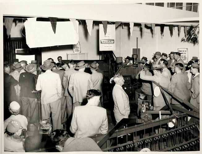 Sunshine Massey Harris promotion at Wagga Wagga, New South Wales, circa 1955. A crowd stand in a room and watch as a Sunshine Massey Harris representative performs a demonstration using agricultural machinery. Other equipment is set up in the room which is decorated with flag bunting and gum tree branches.