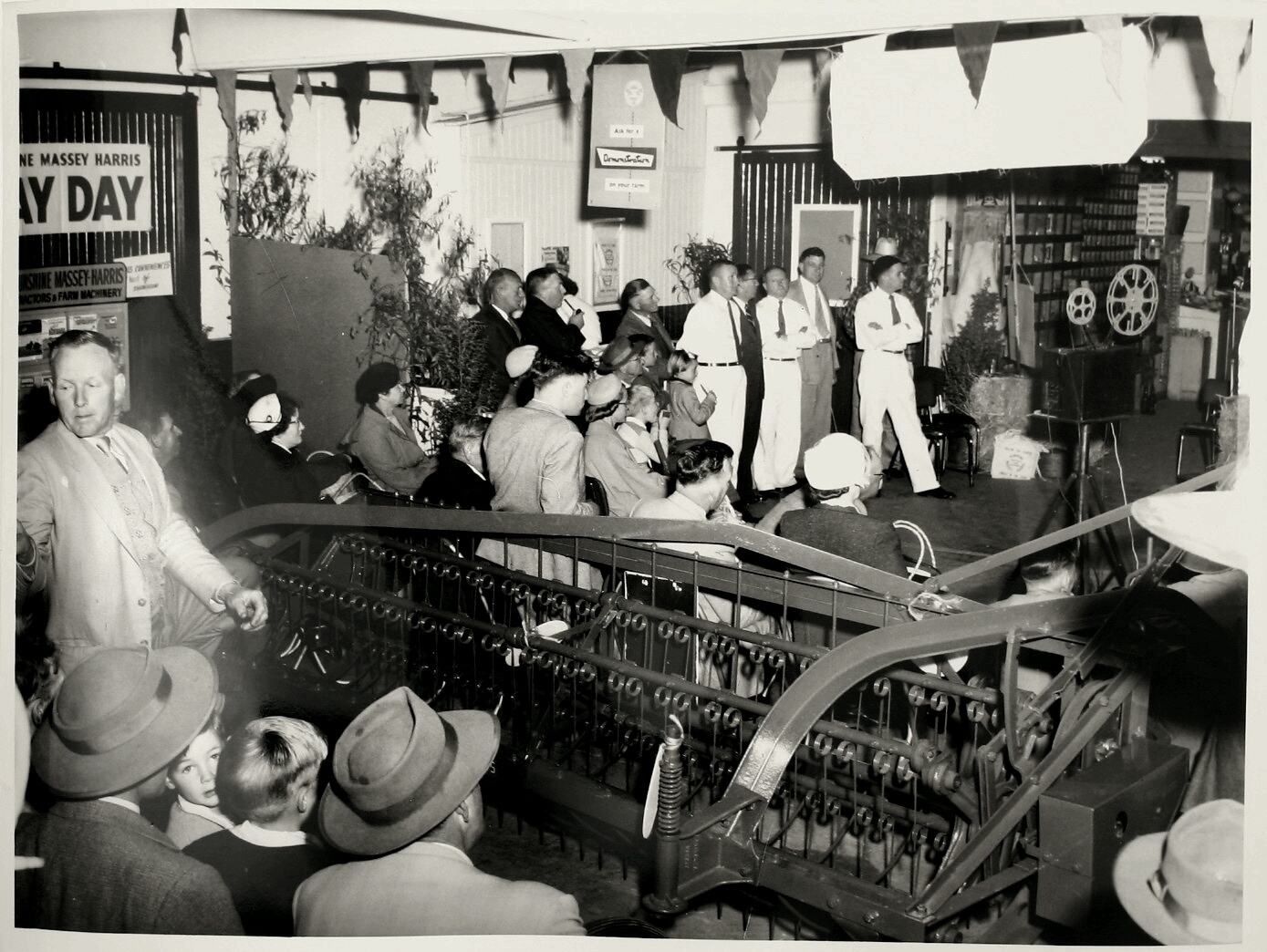 A seated crowd watch a Sunshine Massey Harris promotion at Wagga Wagga, New South Wales, circa 1955. Agricultural machinery is in the foreground and a projector is set up to the right. The walls feature Sunshine Massey Harris promotional signs which also hang from the ceiling. Sunshine Massey Harris representatives wearing white shirts, pants and dark ties stand near the front of the room beside the wall. Flag bunting, hay bales and gum tree branches decorate the room.
