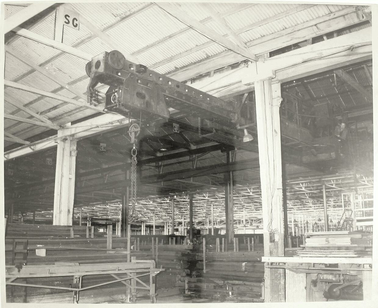 Black and white photograph of a steel store at McKay Massey Harris, Sunshine.