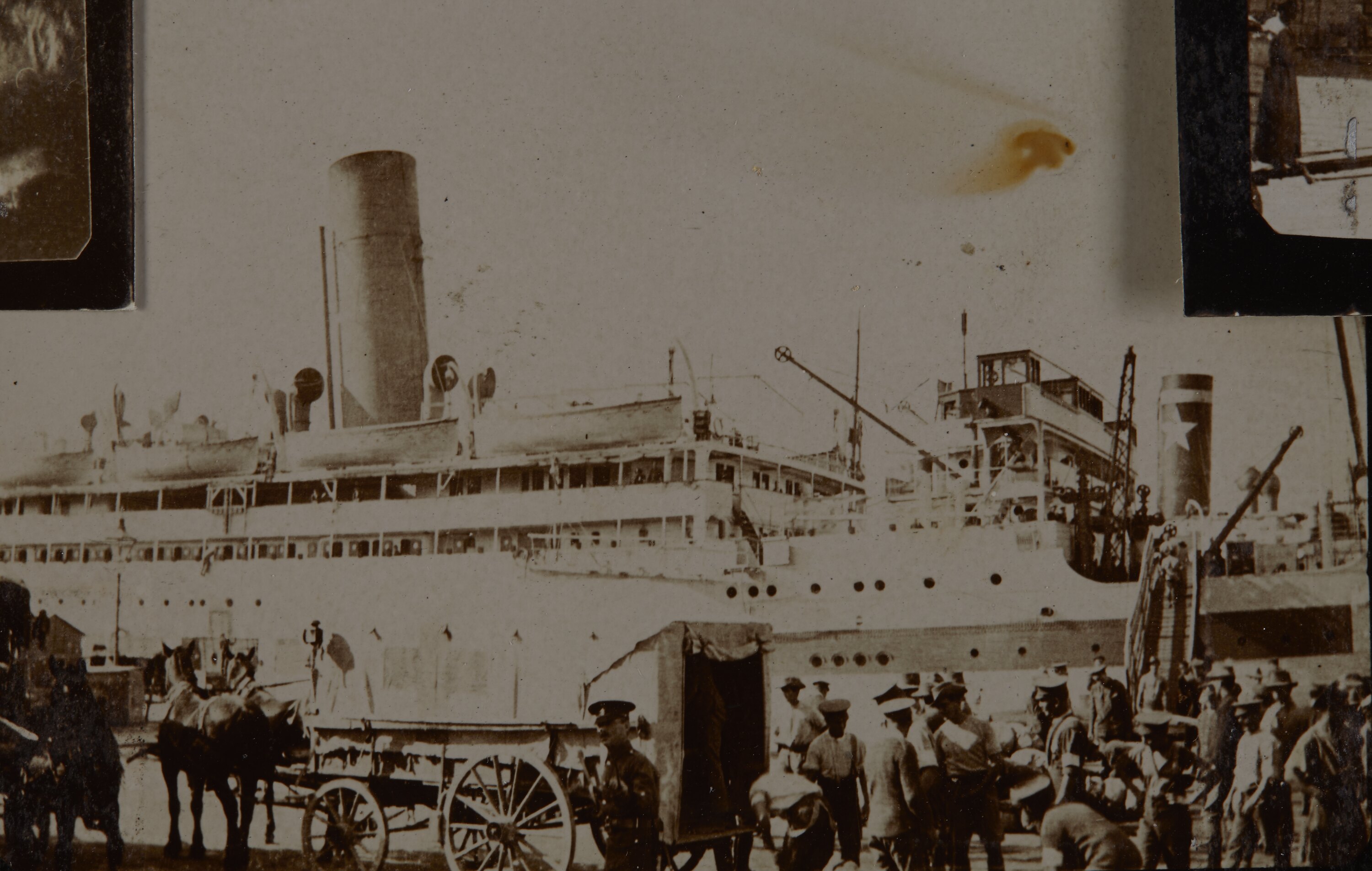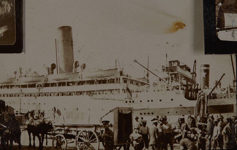 The dock at Alexandria is busy with soldiers unloading the wounded. many have their jackets off, sleeves rolled up. In middle foreground a horse drawn ambulance is waiting, a soldier stands in its open back. A single funnel hospital ship is berthed against the wharf with its gangway down. Soldiers are walking up the gangway. An officer in the middle foreground points a stick at the photographer.