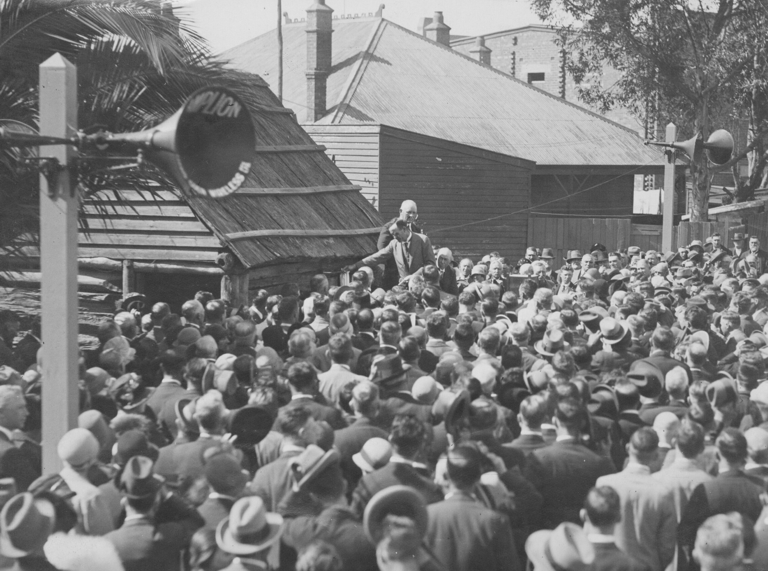 A crowd of people gathered for the opening of the H. V. McKay blacksmith workshop at its relocated site on the grounds of the head office of the Sunshine Harvester Works, Sunshine, Victoria, in 1928. McKay built his first agricultural harvester in this wooden-slab 'smithy' in Drummartin, Victoria in 1884.