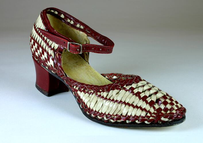 Right foot, low heeled, female dress shoe of maroon and cream leather basketweave. Enclosed shoe, slightly rounded shape toe with cross strap and plain buckle fastener on right side. Lower back shoe section and toe cap are woven in a checkered pattern, the top portions appear as two rows of vertical stripes, while a unique pattern embellishes the vamp's central area and the top line and cross strap is in unwoven maroon leather. Complete with a neutral coloured quartier and leather insole lining. Neutral coloured leather sole is inscribed and stamped on base, the heel is 4cm height and depth with three tacks connecting heel to sole. Leather wraps around heel, joining at heel breast centre.