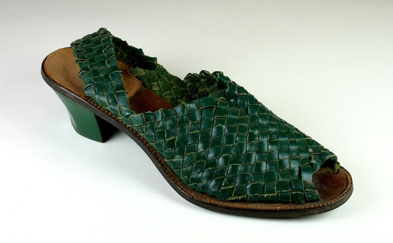 Right foot low heeled female dress sandal of green leather basketweave. Enclosed shoe with open toe and strapped open back in a criss-cross basket weave pattern of leather. Neutral coloured leather heel insole with the remainder insole being of a darker brown colour. Brown coloured leather sole, with heel of 4.5cm height and 3cm depth, stitched around base and three tacks connect heel to sole. Leather wraps around heel, joining at heel breast centre.