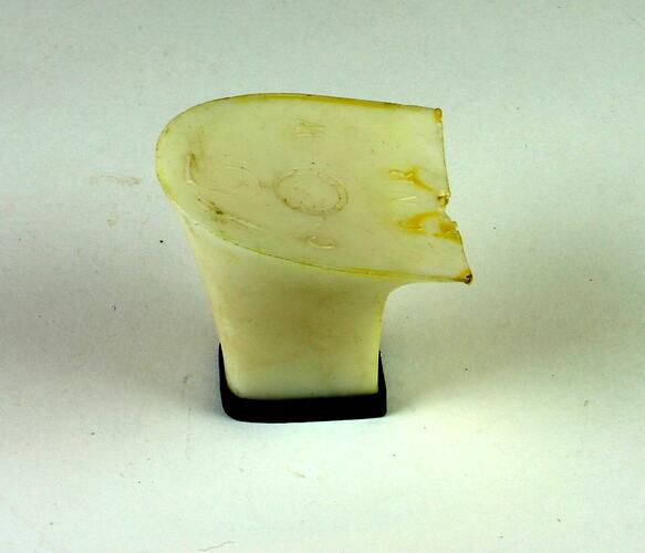 This white plastic heel complete with its black top lift is part of Stanio Fancoff's shoemaking stock. This heel is a component of the shoe's internal framework that Stanio created and then encased within leather at his shoemaking business. Along with many other external components, this plastic heel was an integral part Stanio's shoemaking business.