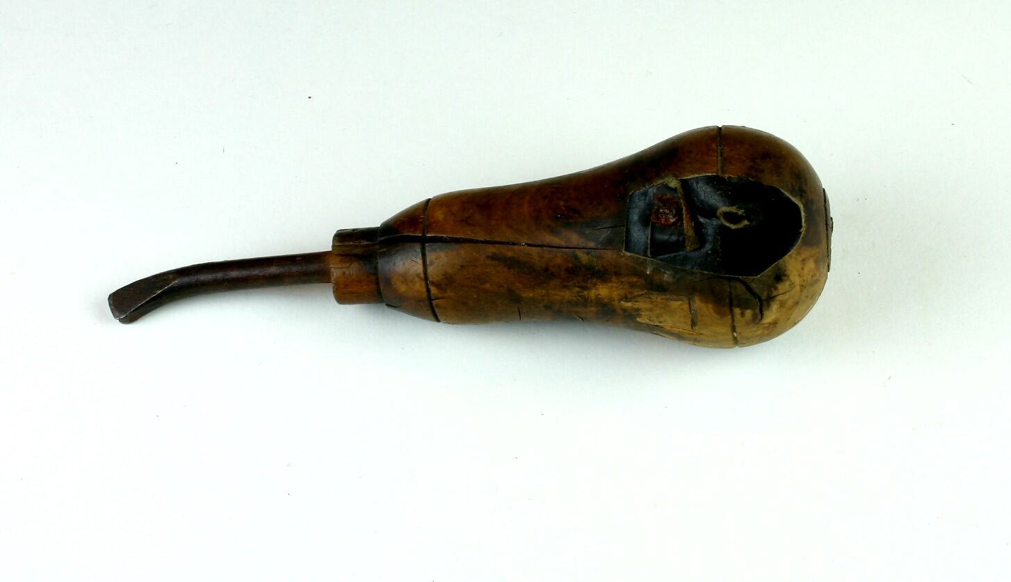 Although many stitch prick variations exist, they all commonly combine a blade with a wooden handle that resembles a small screwdriver. This particular tool is framed by a wooden necktie and the blade's end appears turned up, flattened with a central 'V' shape. The pear shaped handle has horizontally incised lines located within both the top and lower handle portions. The base exhibits the central metal tool end point encircled by an incised line. The light coloured wood exudes extensive dark areas possibly from stain or paint transference. Furthermore, two opposing vertical cracks running from top to the midway point expose the internal join of tool to handle, while three smaller cracks appear within the lower portion. Similar to many shoemaker tools, this double stitch prick has a dark tanned leather strap with a button hole plus an additional leather piece simultaneously singularly tacked the handle's lower portion.