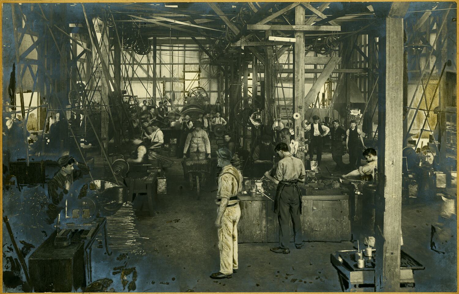 Factory interior at the H. V. McKay Sunshine Harvester Works, Sunshine, Victoria. Men are at work manufacturing agricultural implements and components. The workshop includes steam powered metal- working machines with overhead belt drives. There is a blacksmith's forge at the rear of the factory. Some of the workmen are threading spokes on the threading machines for later assembly into the main or off-side wheels of the combination harvesters.