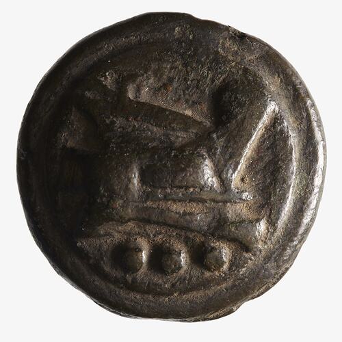 The prow of a Roman war ship; below, three beads