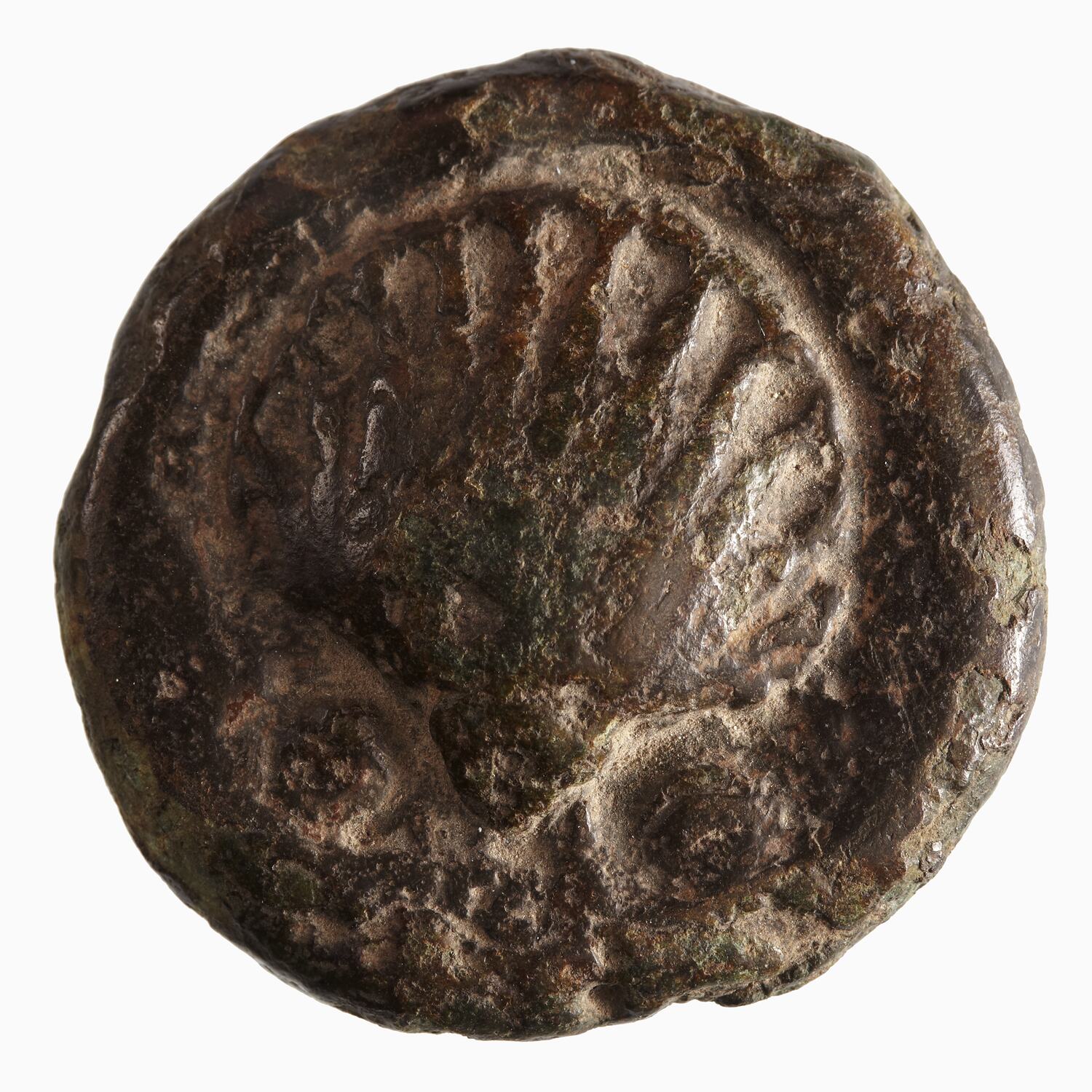 The earliest copper coins of the denomination 'as' weighed one Roman pound (about 329 g.) and were produced by casting from about 280 BC. There were 12 Roman uncia in a Roman pound and 12 uncia coins to the as. This coin, a sextans or sixth of an as was worth 2 uncia, hence the two dots for the denomination on each side. Cast coins were not produced with exact weights but the average weight of a large sample would have been close to the desired standard.