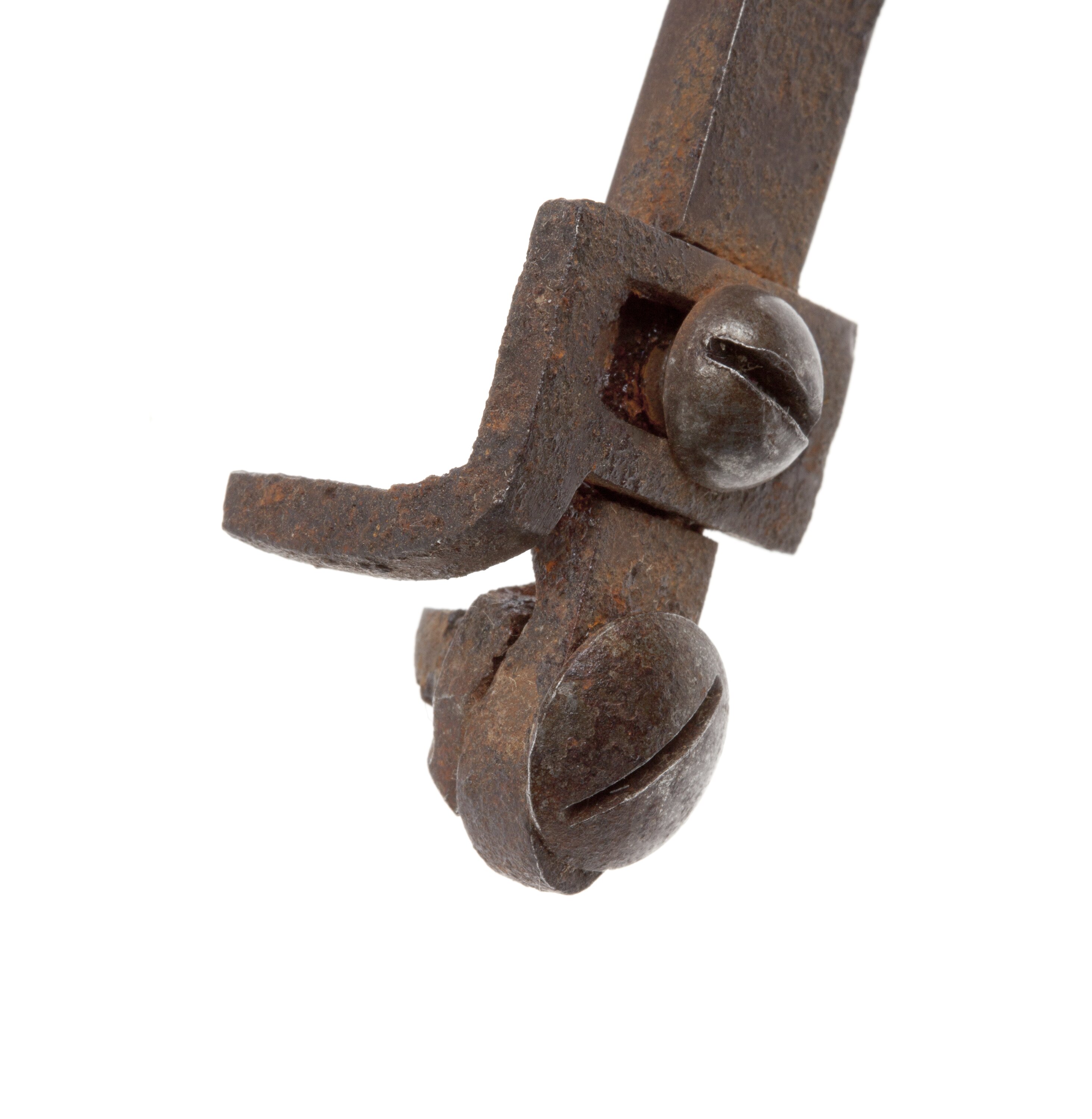 Similar to many shoemaker tools, this unknown tool combines a medium coloured wooden handle with a attached metal instrument. The instrument with its metal necktie exhibits signs of ageing. At the instrument's end two screws hold attachments in place. The first attachment is unknown, but what remains references a possible wheel. The second retains an adjustable arm, allowing the tool a permanent measuring device. Underneath these two devices on the instrument's face is the instrument's makers trademark "'A (? possibly the shoe image trade mark) / GEORGE / BARNSLEY/ SHEFFIELD". The medium brown hour shaped wooden handle has singular horizontal lines incised within the upper and lower handle portions. Furthermore, it has a medium tanned leather strap with a button hole plus an additional leather piece simultaneously singularly tacked the handle's lower portion.