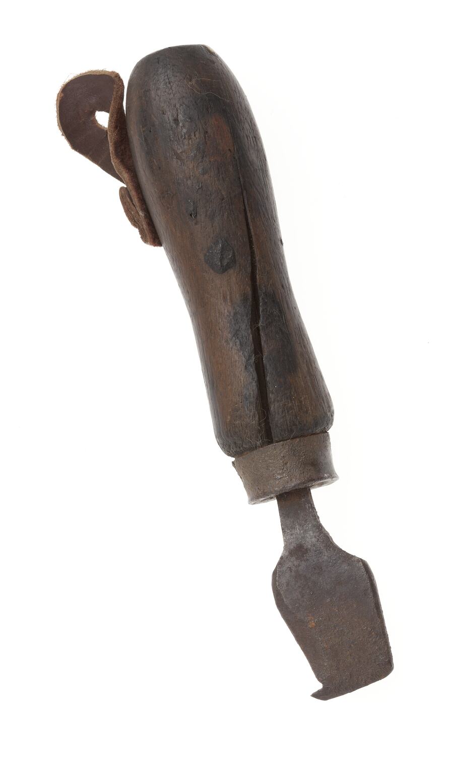 Dark colored wooden handled edge iron tool. The dark brown hour-glass shaped handle tapers towards the tool/handle junction. The handle exhibits two major splits that run almost the handle's length and the wood appears slightly darker near the tool head, possibly from being subject to heat or varnishes during use. Furthermore, a small medium tanned leather strap with a button hole plus an additional leather piece have been simultaneously singularly tacked the handle's lower portion. The tool head and handle join are covered by a metal neck, while the tool head appears as a skinny rectangular based shape with its functioning side resembling a wine-glass complete with an exaggerated lip. Furthermore, on the larger flat tool head side an array of inscriptions suggest the tool maker's details.