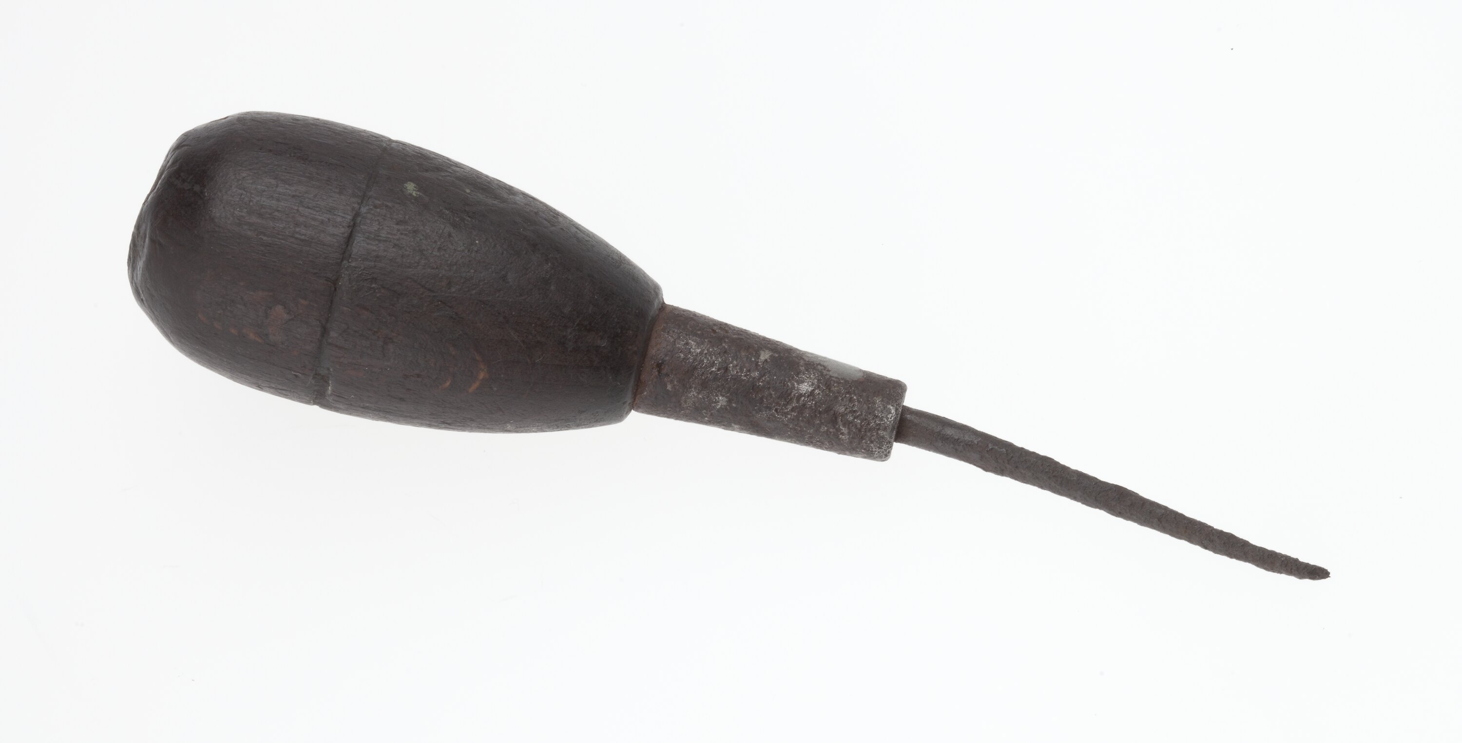 Dark wooden pear-shape handled awl tool.The metal blade is rectangular in form with a slight 'S' curve shape that tapers to a point. The wooden handle's head has a flattened square surface area possibly used to enhance hammer/punch contact zone. The handle is encircled with an inscribed thin line in the top third portion, but overall the handle appears stained, perhaps caused through shoe polish or varnishes.