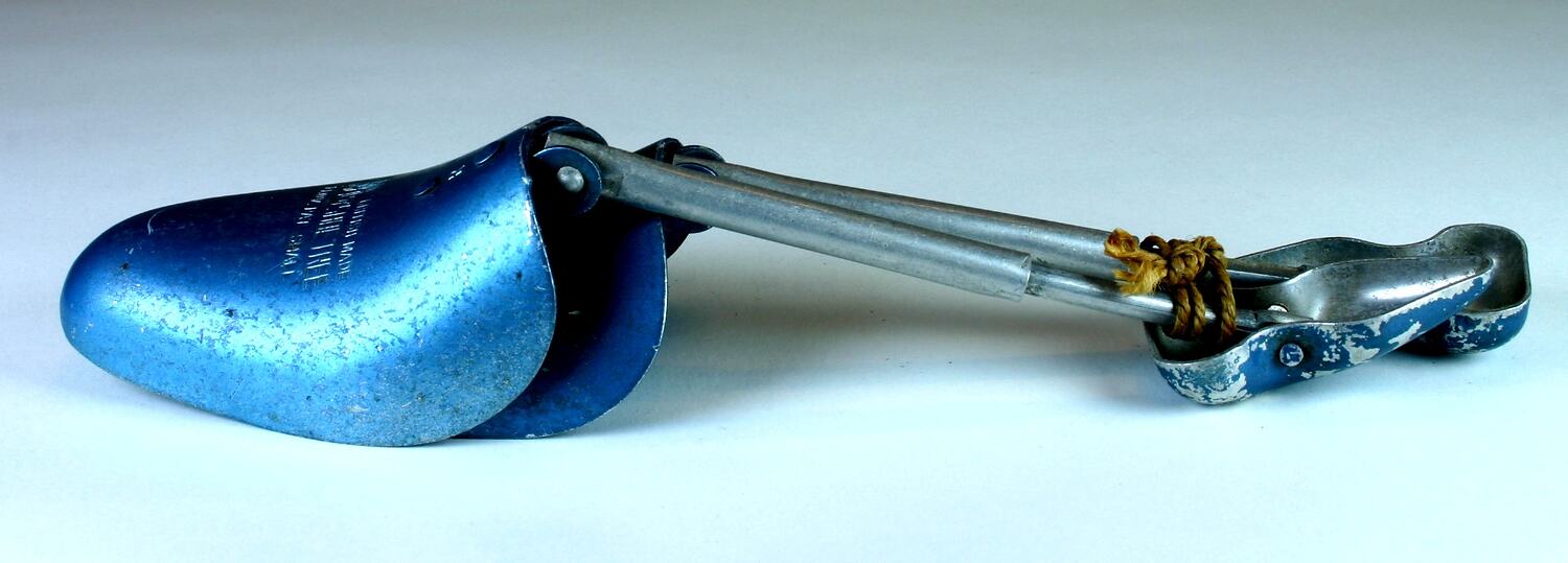 This pair of blue aluminium shoe trees were most likely used by StanioFancoff to help maintain the shoe's original shape and help prevent creasing and cracking. Although shoetrees are available for both women's and men's shoes, the inscription of 'SMALL' and the indicators 'L'(left) and 'R' (right) suggests this pair were shoe specific. Inserted within the shoe, the shoetrees were an important part in Stanio's after shoe production care procedures.