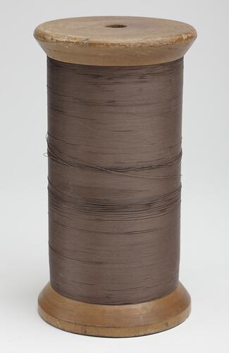 Large manufacturer's timber reel with a sheath of brown cotton. The sold timber reel has a cyclindrical shaped core with shallow half conical ends that maintain the thread's unwinding operation and its position upon the reel. Whilst solid in structure the reel has a small round opening that passes through the reel. The light timber reel material exhibits signs of various scratches and abrasions suggesting use and ageing. Appearing thick in depth, the brown cotton spools around the entire reels cyclindrical section and up 3/4 of the conical ends, leaving visible a small shallow section of the reel.