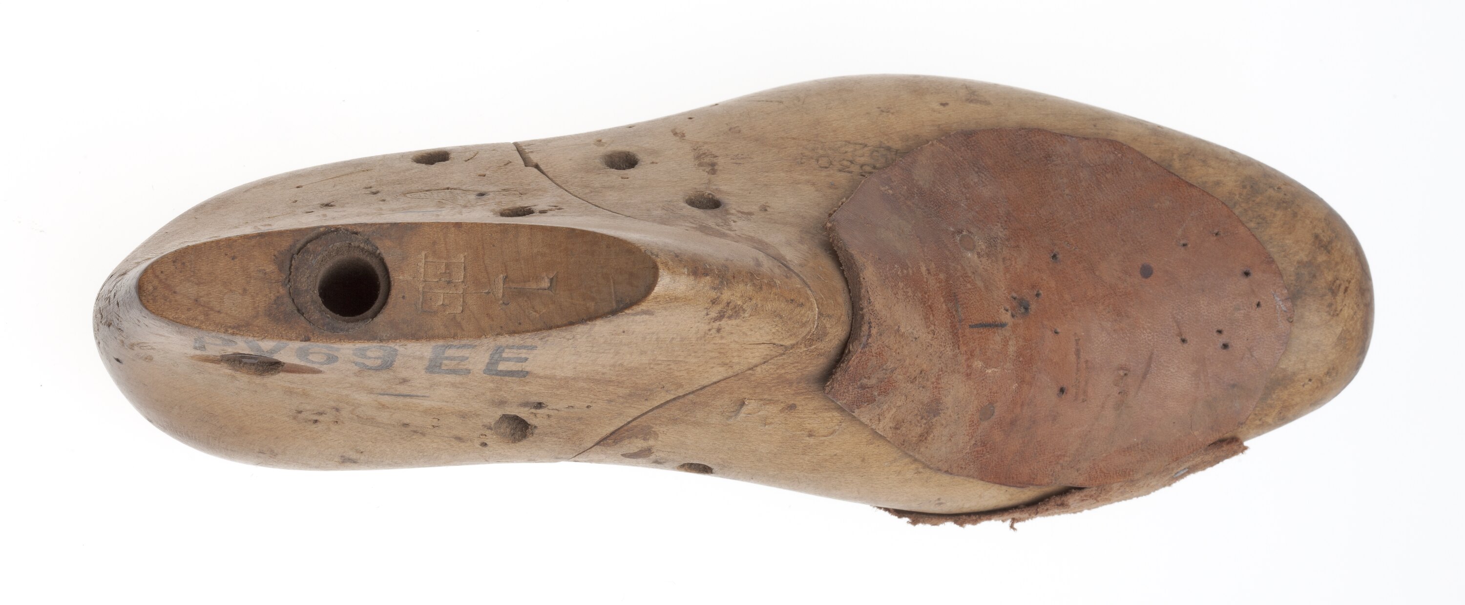 Left foot solid wooden sculpted shoe last within a generic foot shape. Created from a solid light timber, the shoe last has eight puncture marks which appear to have metal placed within them and additional riverts run horizontally through the back top ankle area. Furthermore, at the top of the ankle section a hollow round hole exists in which a metal casing has been placed. The foot mould is constructed within two sections of forefoot and the back heel, whereby the visible join line runs from the vamp's top midway point to back of the arch. Throughout the shoe last several indentations and scratches are present, while located within the lower inner ankle/heel area a small crack runs vertically from the join line. Furthermore, two leather constructed patches adjoin the wooden mould's vamp and the inner flex point. While the vamp leather patch has two nails within its upper section and possibly glue to adhere its lower section, the inner flex leather patch is attached via three nails and has 2mm spaced scored vertical lines. Similar to the wooden shoe last, the metal sole has been created within a dual construct. The metal heel plate attaches via three screws (1back/2 front) and two nails attaching the metal sole plate to the wooden last, while the forefront including the arch has been affixed by three screws (2 back/1 front) and six nails systematically placed between screws. Furthermore, this forefront plate as two round holes allowing access to the wooden underneath sole.