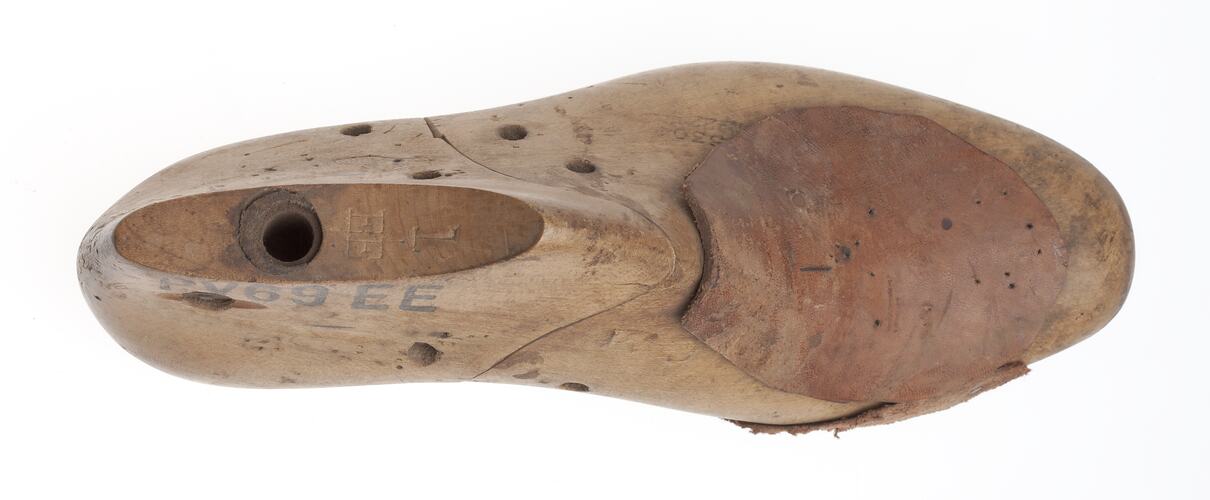 This left foot solid timber shoe last is the form in which Stanio Fancoff's various shoes were moulded upon between the 1930s to 1970s. This shoe last allows the moulding of multiple shoes of the same heel height and toe shape. This particular shoe last's shape with its rounded toe, small foot and heel width suggest this object was an integral instrument used by Stanio in the making of his various womens' basketweave shoes.