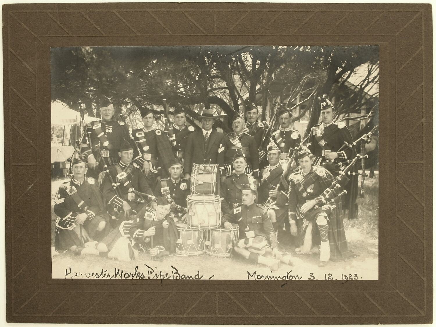Black and white photograph of the Sunshine Harvester Works Pipe Band with Ralph McKay at Mornington, 3 December 1923. The photograph was taken by Hewitt Studios of Little Collins Street, Melbourne.