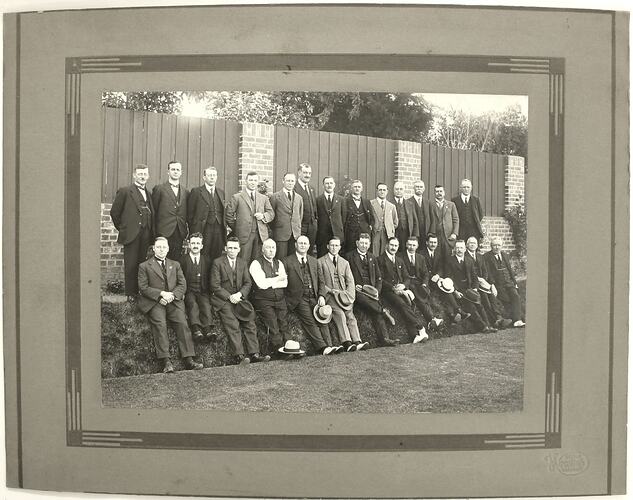 Handwritten in loose paper on back are position and peoples names, and also the following, 'It was at Ballarrat - about 1919 for a guess, / after a game of bowls. / About half of them would be Ballarat men. / other half from Chamber of Manufacturers.