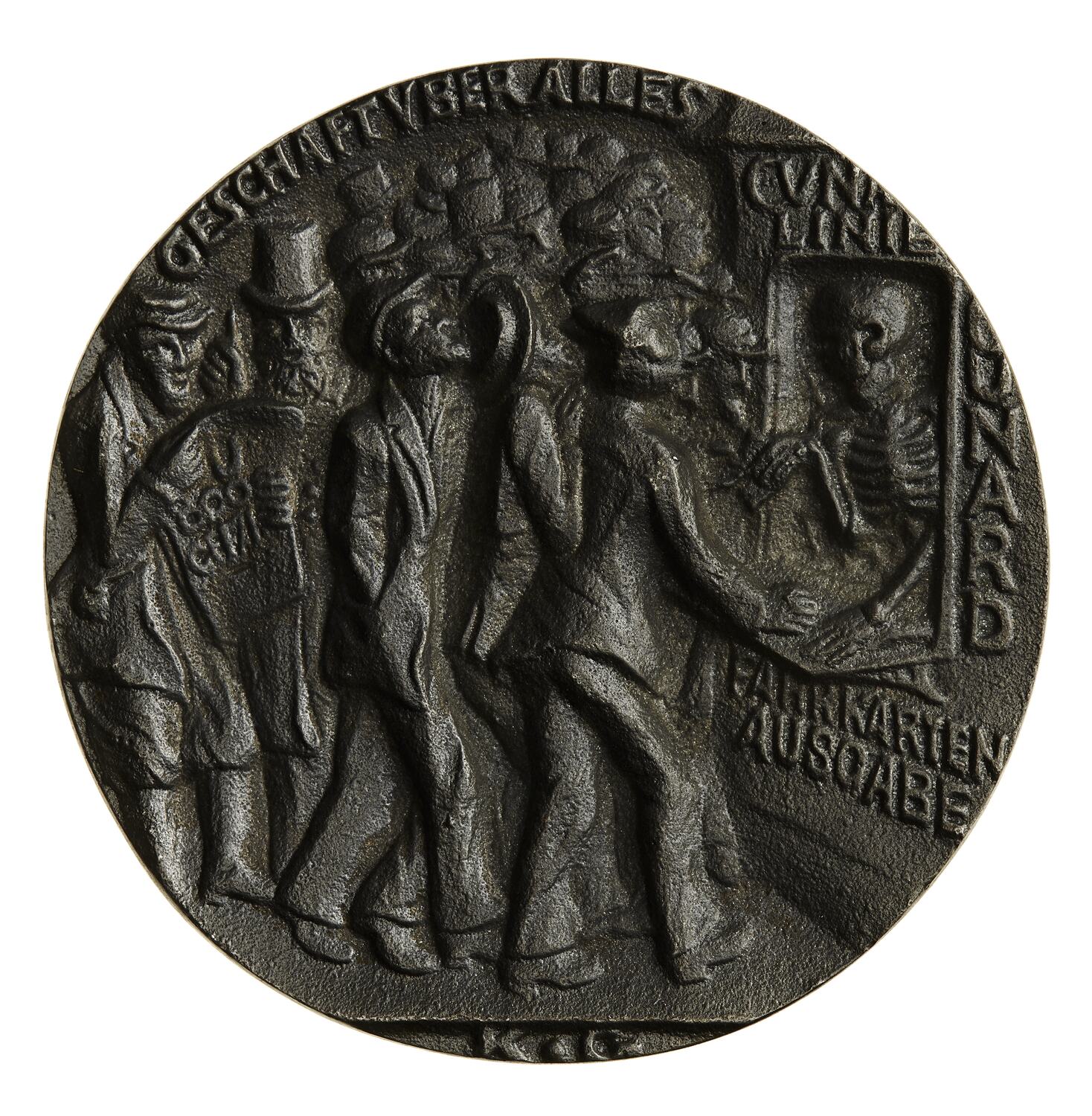Death selling tickets from the Cunard office to a crowd of men, one of whom is reading a paper which warns of U-boat activity; around above, GESCHAFT VBER ALLES (translation: buisness above all); in exergue the original German artist's initials KG (Karl Goetz)