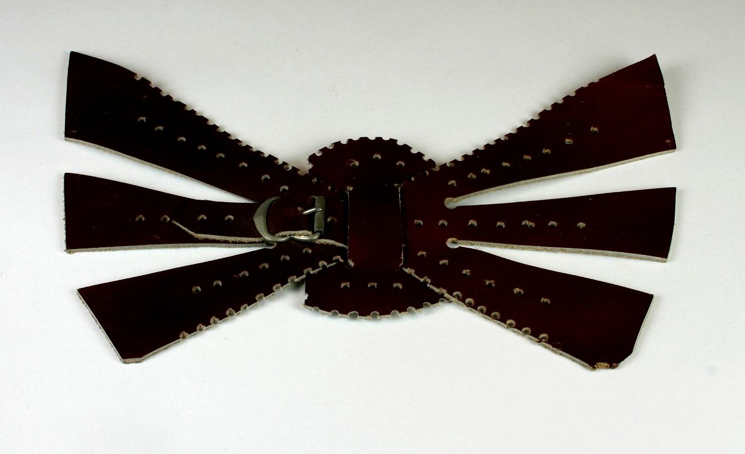 Dark tan leather sample, created from a two piece construction. First, the central oval disc appears with its vertical sides cut straight. The disc is adorned by three hole punches both top and botton, plus the top and bottom edges have been half-punched to provide an ornate edge-line. Measuring 4.2 x 8cm, this disc has two parallel slit lines running lengthwise, that allow the secondary piece construction to sit within and attach. The secondary construction piece is created in the same leather as the central disc. Attaching through the central disc slot, each side of this secondary piece has three leather projections, totally six in all. The top projects have eight holes punched along a central line, the second row of projections has seven holes punched, whilst the lower right has seven holes and the lower left retains six central lined punched holes. In addition, the left middle projection has an additional leather overlap in which a plain silver buckle fastens. Similar to the central disc, the inner top and inner bottom edges of the secondary piece have been half-punched to create an ornate edgeline. All holes punched appear within an evenly spaced and uniform format. While the leather's front side appears smooth with a slight sheen, the reverse side exhibits the skin's natural fibres.