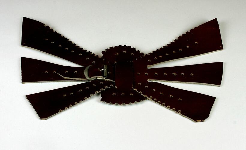 This dark brown coloured leather sample, with its punched central leather disc and buckle, and six branching leather straps was created by Stanio Fancoff sometime between 1930s and the 1970s. This particular leatherwork sample indicates both leather colour and a particular ornate decorative pattern style. Along with many other leatherworking samples, this leather sample was most likely shown to prospective purchasers as examples of Stanio's shoeware styles which were made from his shoemaking business in Fitzroy by himself and family.