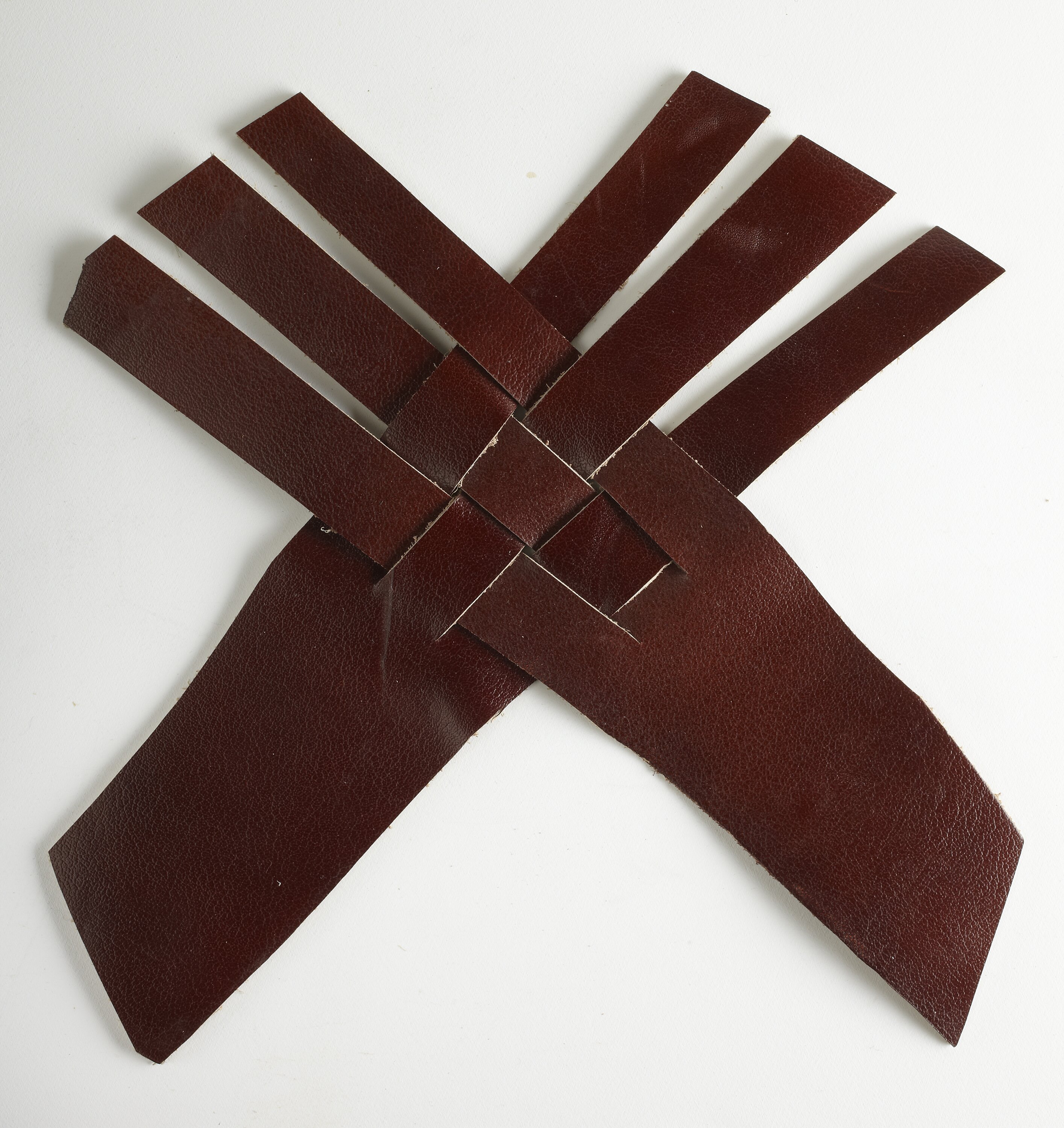 Two rectangular-shaped brown leather pieces, in which both pieces have two parallel slices to create three equal strands that end at approximately the midway point. These six strands are interwoven within an under/over fashion to create a criss-cross or checkered weave format. The straight edge form suggests this piece was sliced with a knife and ruler. While the front side appears smooth with a slight sheen, the reverse side exhibits the skin's natural fibres.