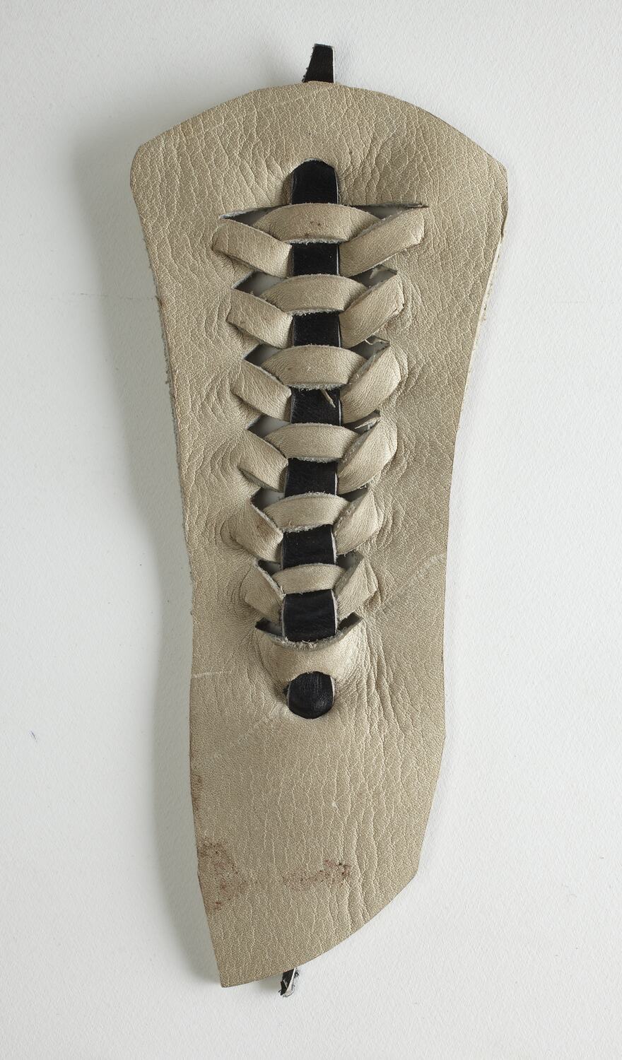 Small cream/tan leather piece with a dark brown leather strap interwoven within and against its central woven pattern line. The oblong/rectangular cream/tan leather piece has thirteen horizontal slits, whereby each leather strap overlaps its partner and the thin brown leather manoeuvers in an under/over fashion to plat this overlaping format. At the beginning and end of this central weave form are three slices (one at the top and two at the bottom) where the brown leather strap is held to begin and end its journey with a small section of the brown leather extending beyond the central cream/tan leather piece . The leather appears supple but in the lower left area, the leather exhibits signs of staining whilst a diagonal line, a mark or possible scratch runs from the left lower midway point ascending to the right edges midway section. While the leather's front side appears smooth, the reverse side exhibits the skin's natural fibres.