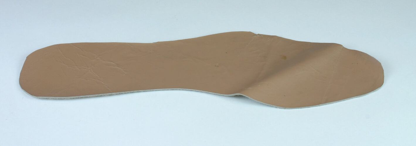 Right foot, hand-cut, light tan coloured supple leather inner-sole. In good condition but exhibits extensive signs of creasing or crazing within the heel area and along the left hand edges. In addition, a raised section descends from the left edge toe area to the lower foot pad, possibly suggesting a folding mark, whilst two crease lines appear slightly off horizontal within the toe area. On the right edge upper quarter mark, a small slice appears at a diagonal ascending approximately 1cm into the soles framework and a small area of this is missing, plus the sole exhibits several signs of impurities. While the front side exhibits a smooth appearance, the reverse side shows the skin's natural textured fibres.