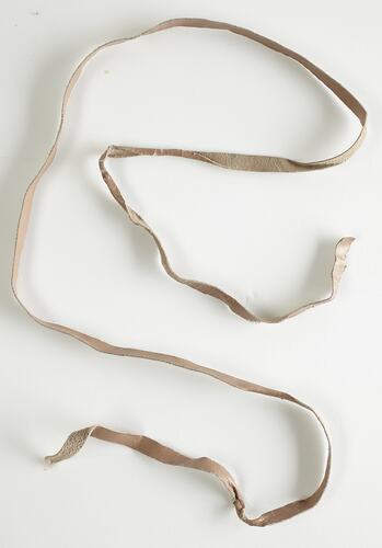 Neutral coloured supple long thin leather strap. Exhibiting signs of cracks and leather folds in several places, suggest that it has been used within eyelets at some point.