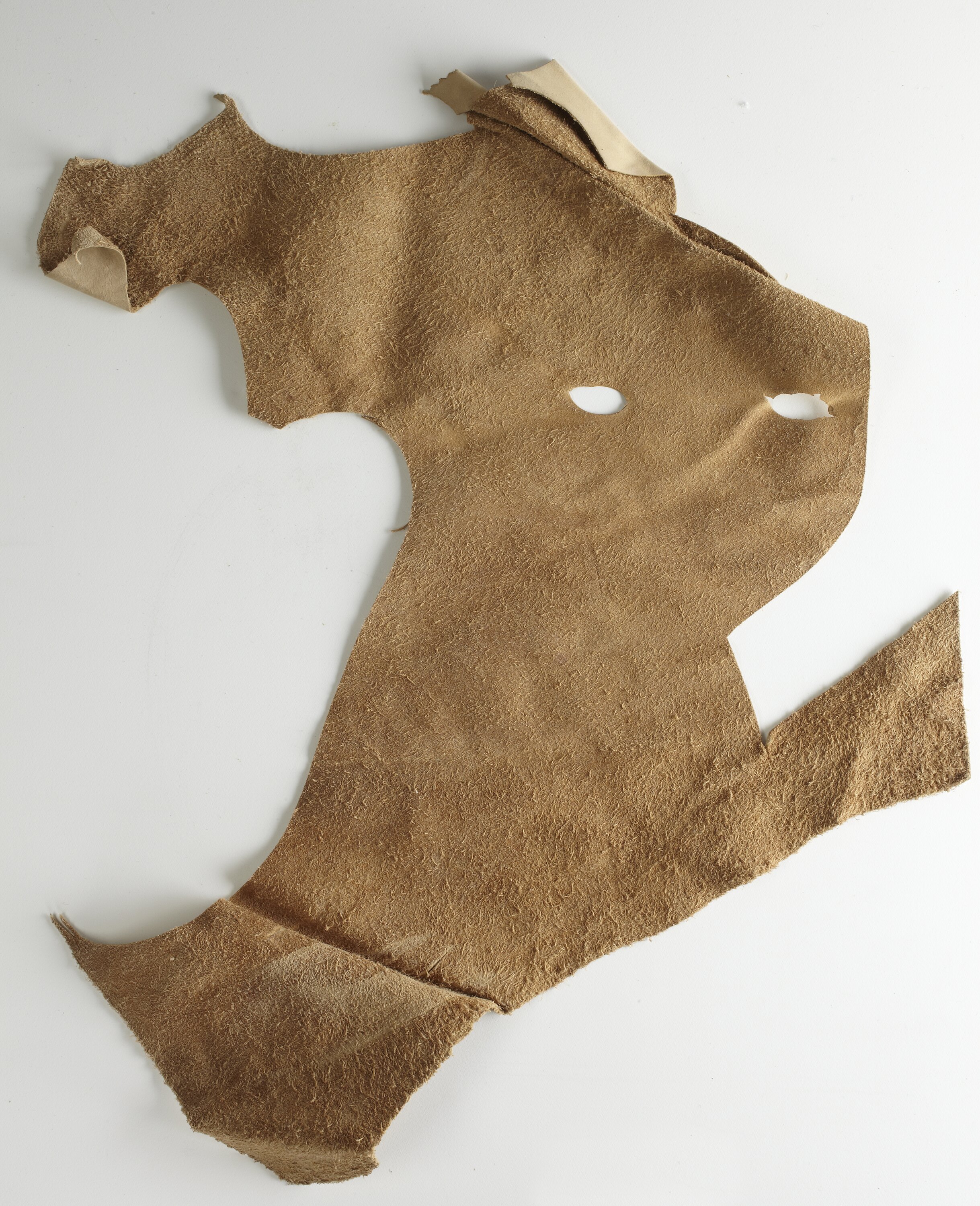 Large, supple, camel/cream coloured leather. Sporadically cut, this piece has no definitive outer shape but off centre are two eye shaped holes of approximately 2.5 x 1cm. Furthermore, the leather has several random folds and appears to have numerous areas that appear lighter in colour to the overall tanned colour. While the front side has been buffed, the reverse remains in a natural state showings is textured fibre surface. Furthermore, the reverse side leather is a light brown hue with a single area in a lighter colour, suggesting possible surface scratching.
