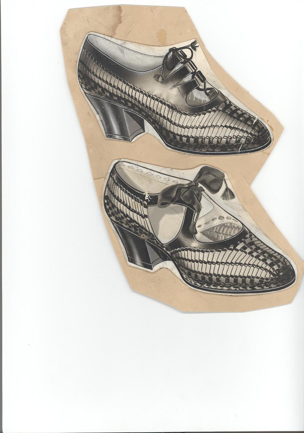 Printer's proof sheet illustrating examples from Stanio Fancoff's women's basketweave shoe range, 1930s-50s. It was most likely used for an advertising leaflet, promoting Stanio's expert design and production skills.