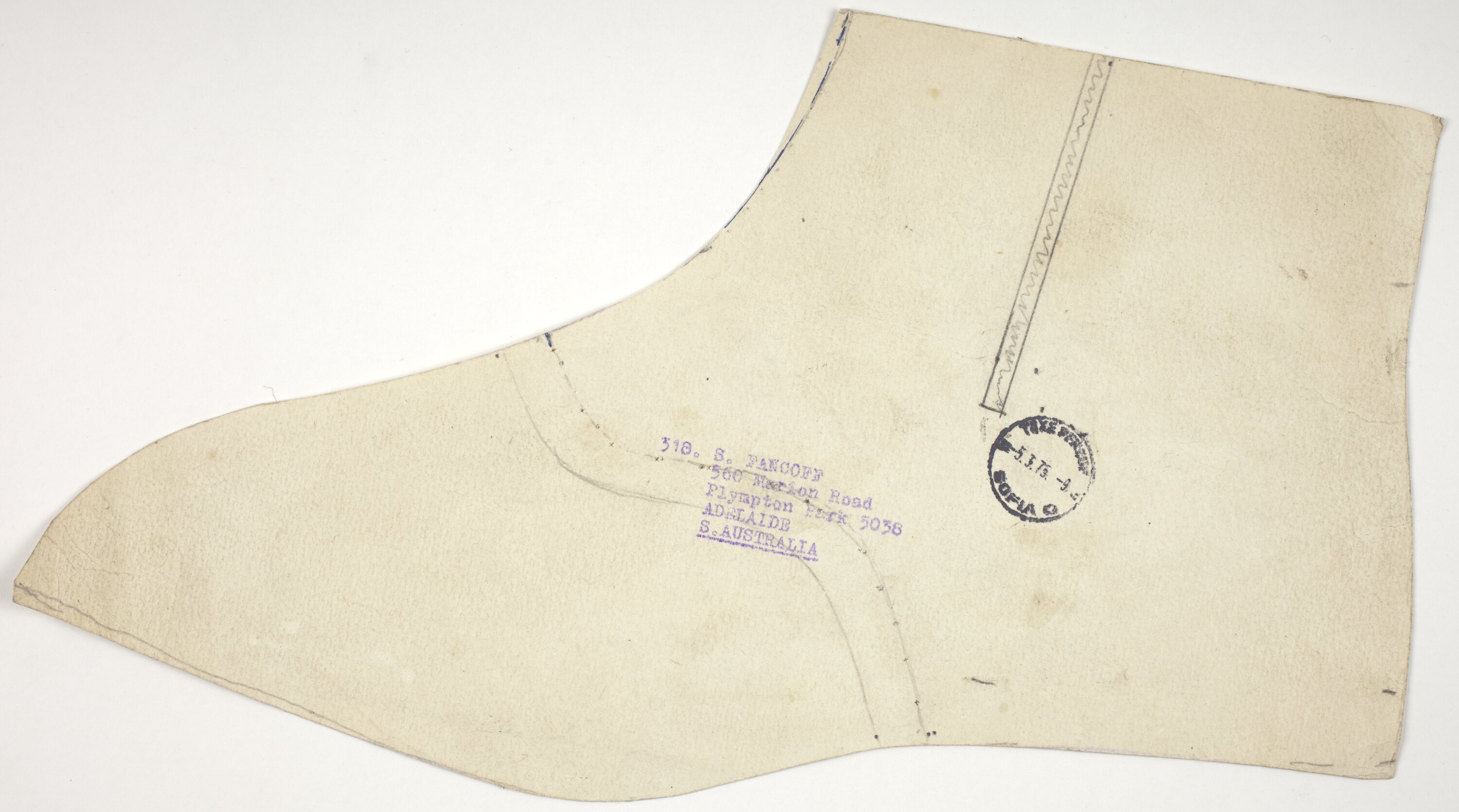 Stamped in Purple Ink, central position :318. S. FANCOFF/560 Marion Road/Plympton Park 5038/ADELAIDE/S. AUSTRALIA.(country is underlined) Stamped in Black Ink, posited around ankle bone location, circle format: taxe perzuf / 5.3. 75. -9. SOFIA Co