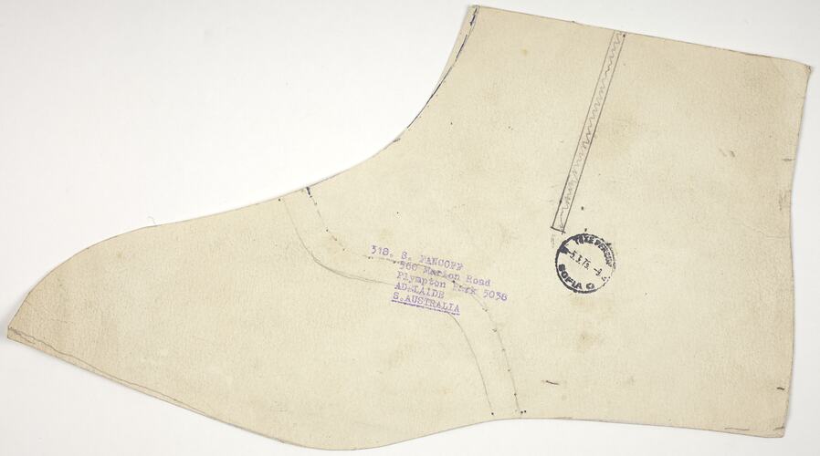 This hand-cut ankle boot pattern has been created on thick quality cream paper most likely used by Stanio Fancoff for creating his various shoes. Stamped with S.Fancoff and his Adelaide address locates this pattern to have been created in the 1950s, during the later years of Stanio Fancoff's shoemaking career. Amongst many others, this pattern is part of the shoemaking designer kit that enabled Stanio to acquire versatility and different fashions within his shoemaking trade.