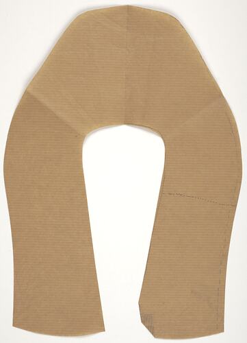 Generated from lined brown paper, this stylised 'U' shaped shoe pattern has several pencil and pen markings. A pencil marked line parallels the inner U shape's top edge and follows down the inner right side, while on the outer right edge a dashed line ascends from the base and once hitting curvature it transforms into a consistent line. Furthermore, at the midway point a penned dotted line stems between the outer and inner edges. Although the pattern appears to be in good condition, it has been symetrically folded length ways and folded to make diagonal creases within the top portion. In addition, the lower right inner corner has been folded, possible due to incorrect storage or careless use.