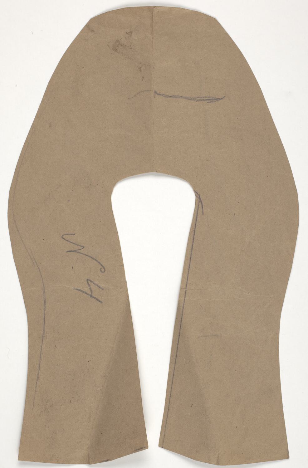 Generated from brown paper, this stylised 'U' shaped shoe pattern has several pencilled markings. Firstly, a horizontal pencil mark (approximately 6cm length) is located within the base of the U shape. Second, a straight edged line runs parallel to the patterns inner right edge, whilst on the left outer edge a free-hand curved line emphasises the patterns curvature. In addition, located within the pattern's left flank is 'N.4' written within cursive inscription. Although the pattern appears to be in good condition, it has been symetrically folded length ways and there are several creases and various smudges.