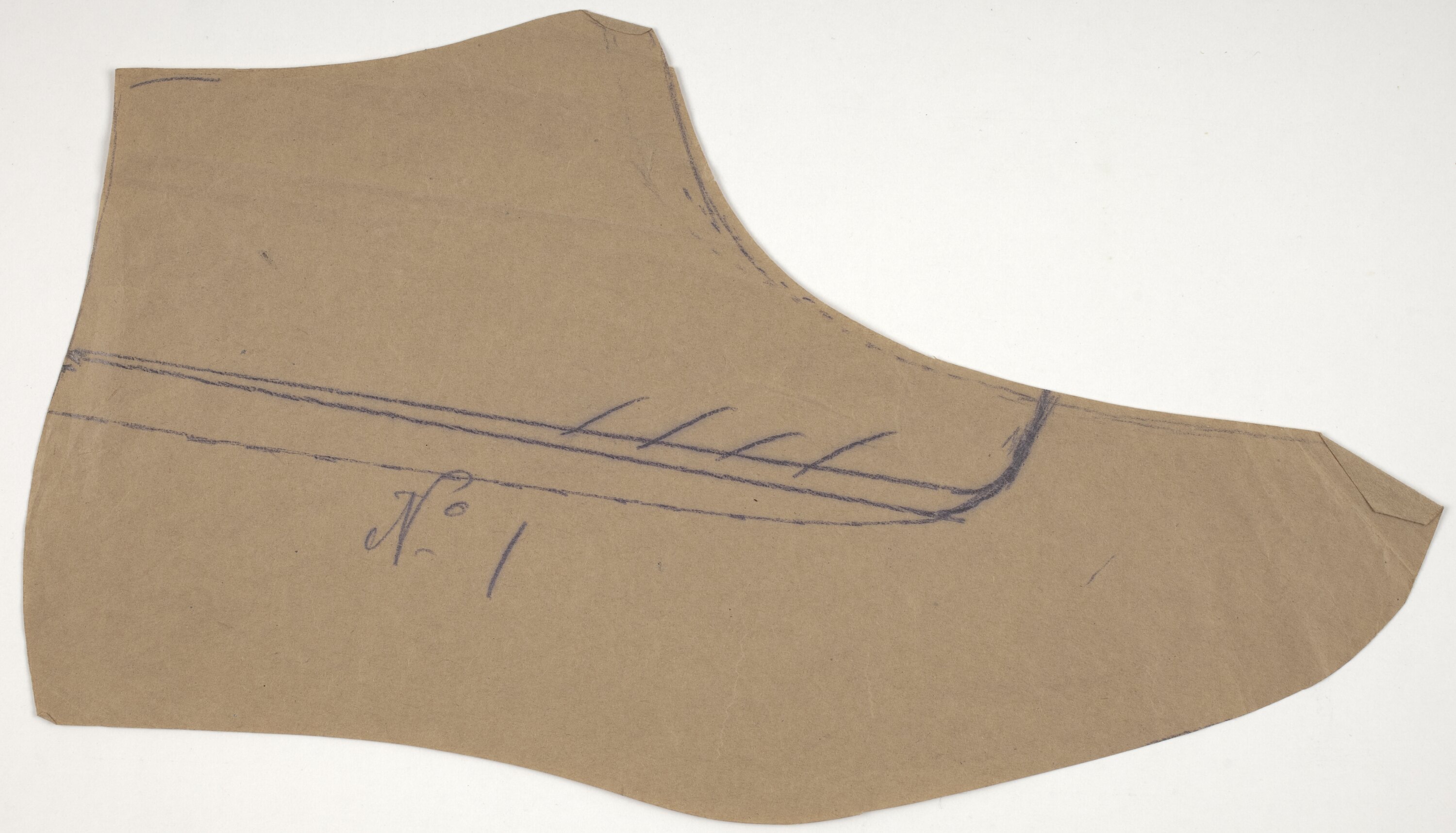Drawn within a side-view perspective the boot's toe faces right. This pattern's shape visuallly references a ankle height flat based boot. Generated on brown paper this pattern has several pencil markings. First markings are located midway within the pattern's horizontal plane and appears as three ruled lines that slightly descend (approximately 4 degrees) from shoe back to front and intersect at the three-quarter across point with a vertically line, that has descended from the boot's vamp topline. In addition, located within the first upper ruled line's right hand portion are four short diagonal marks that ascend from left to right. Located within the boot's tongue, vamp and toe box upper areas is a singular line that parallels the shoe's edge. Written within cursive script the inscription "No1" is positioned central to the boot's frame. Although the pattern appears in good condition, the paper has been folded (possibly through time or incorrect storage) on both the toe cap and the top upper point.
