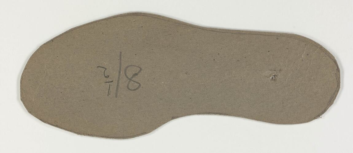 This hand-cut right shoe sole pattern with its various pencil markings and inscription was created from grey commercial cardboard. On the frontside, the grey cardboard exhibits pencil lines that mimic the sole's outer edges while centrally positioned within the footpad are the numbers "81/2". On the backside, the black shiny surface has printed upon it a red stripe line that ends before the cream coloured text. Unfortunately, an area of 5 x 2cm has been stripped, removing the outer cardboard surface and the completion of the text. Furthermore, a small hole is found within the heel area and crease lines can be found within the toe cap and footpad inner.