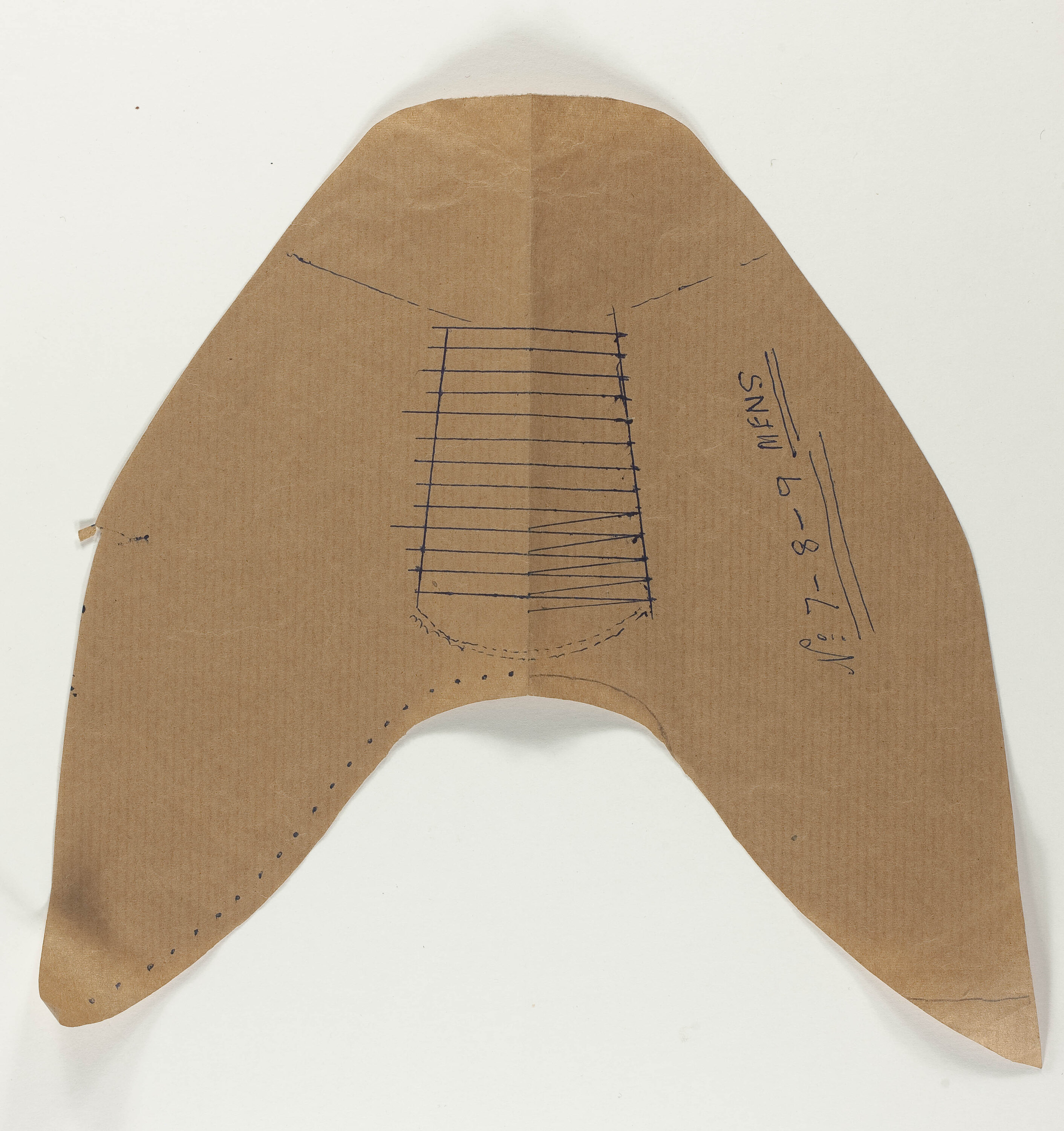 This hand-cut right shoe sole pattern with its multiple pencil markings and inscriptions has been created on brown paper and was mostly likely used by Stanio Fancoff within the production of his various shoes styles sometime between the 1930s to the 1970s. Pencilled upon the sole are the texts, "no.4" and "EN. TOP SOLS" indicating both sizing and purpose. Along with many others, this top sole pattern piece was an integral part to Stanio shoemaking craft and business.