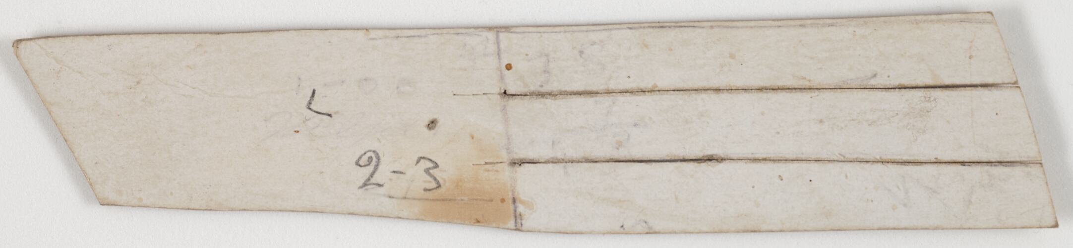 Cream cardboard basic asymmetrical rectangular shaped pattern, left edge is cut on a left ascending 45 degree angle whereas the right edge finishes within a right descending edgeline. Separated by a centrally vertical positioned creaseline, the pattern's left remains as one piece with the pencilled below text while the right side exhibits three equal proportioned horizontal strips with their cut lines manouvering past the central crease line. While the pattern appears in good condition, it does contain a little browning within the lower central section and exhibits traces of past erased writings.